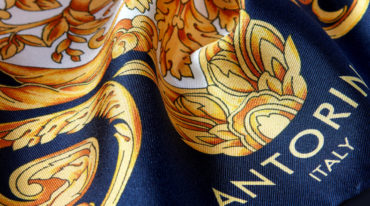 Otisk precizní ruční práce, dokonalý design, to vše promítnuto do luxusního hedvábného základu. Taková je nová kolekce luxusních hedvábných šátků ANTORINI.